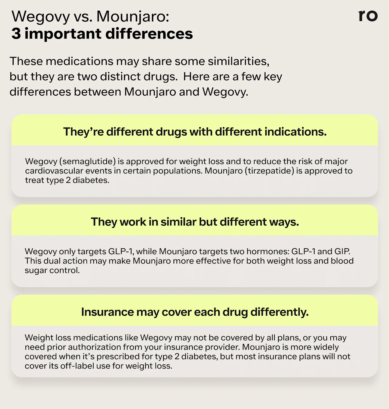 While these medications share some similarities and can both be effective tools for weight loss, they are two distinct drugs with some key differences. Wegovy is approved for weight loss, while Mounjaro isn’t, though some providers may still prescribe it off-label for that purpose.