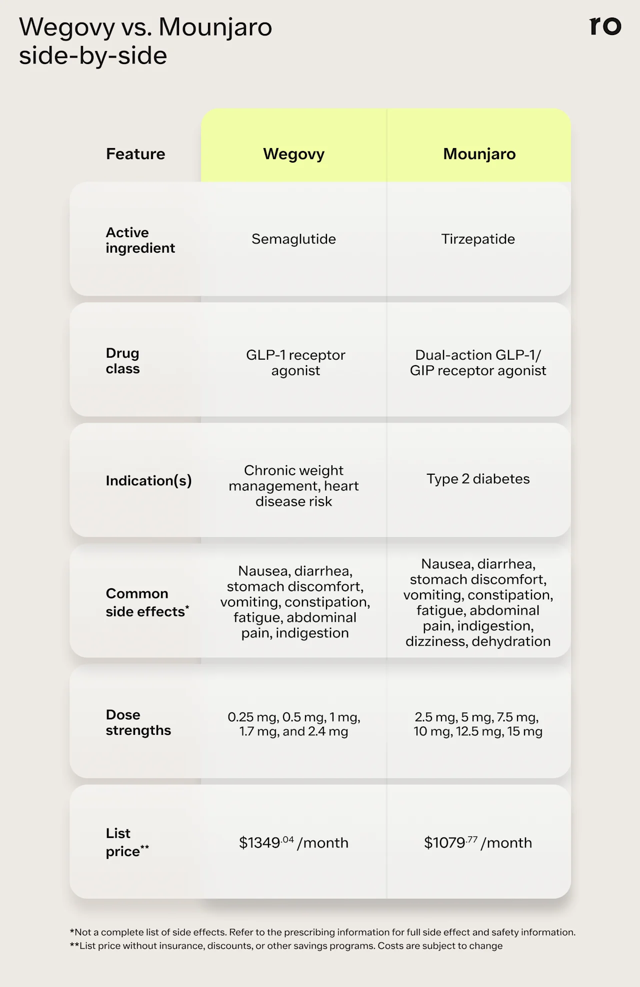 Wegovy and Mounjaro have different FDA-approved indications. Both medications can be effective for weight loss, but only Wegovy is approved for that purpose. Mounjaro is approved for type 2 diabetes. Healthcare providers may prescribe Mounjaro off-label for weight loss, or they may prescribe Zepbound, a version of tirzepatide that is indicated for weight management.