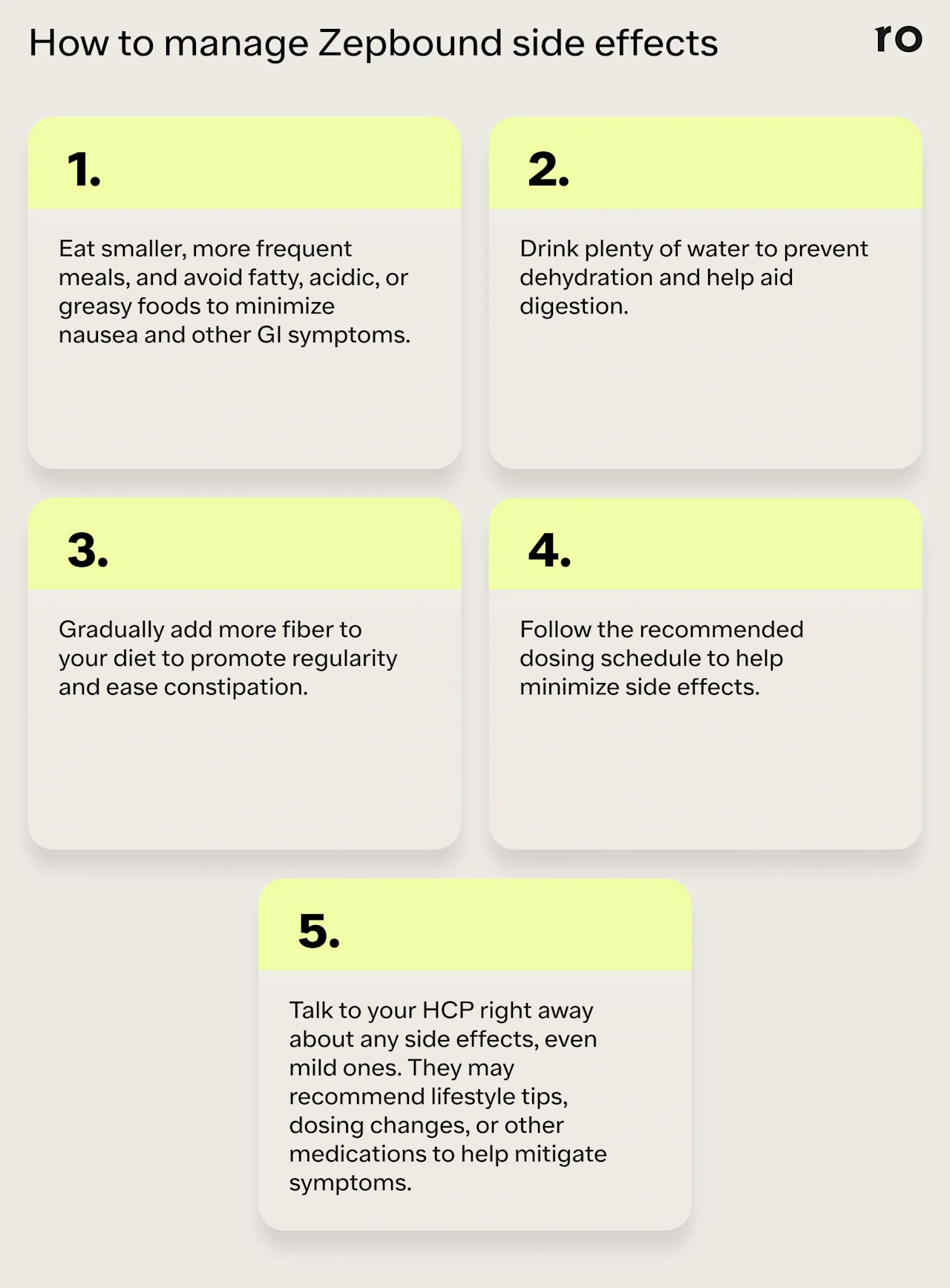 Lifestyle modifications may help ease symptoms. Eating smaller meals, staying hydrated, avoiding spicy or fatty foods, and following your provider’s dosing recommendations may help minimize side effects.